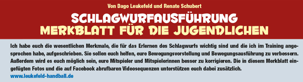 Ich habe euch die wesentlichen Merkmale, die für das Erlernen des Schlagwurf wichtig sind und die ich im Training angesprochen habe, aufgeschrieben. Sie sollen euch helfen, eure Bewegungsvorstellung und Bewegungsausführung zu verbessern.